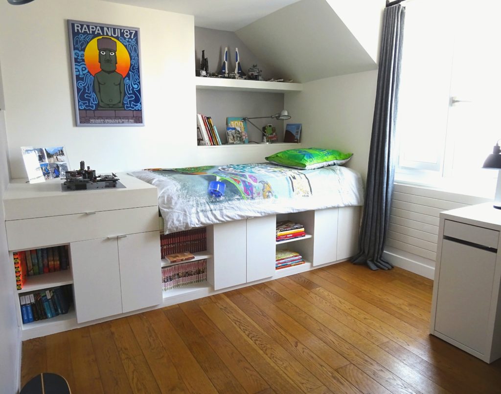 Pour la chambre de l’enfant, nous avons conçu un lit sur mesure afin de libérer de l’espace et intégrer un maximum de rangements.